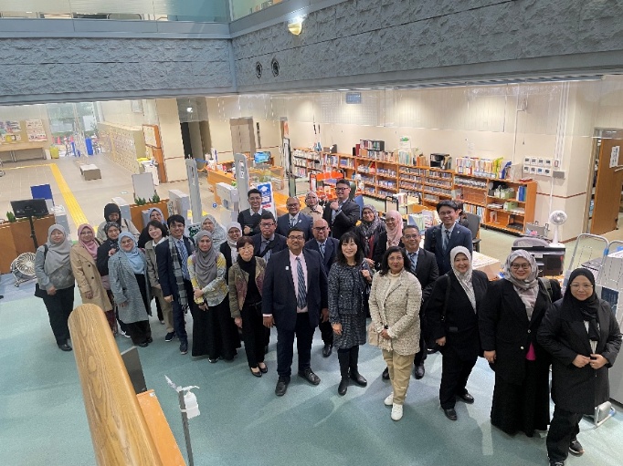 OUM(マレーシア公開大学)から27名の来訪がありました。はじめに、制作スタジオの施設見学を行い、実際の撮影現場で説明を聞き、撮影セットの中で講義体験、記念撮影を行いました。その後、図書館の施設見学をし、仁科図書館長による展示図書や図書館に関する説明がありました。その後館内を自由に見学し、図書館設備の大きさ、設備の充実度に感銘を受けている様子でした。