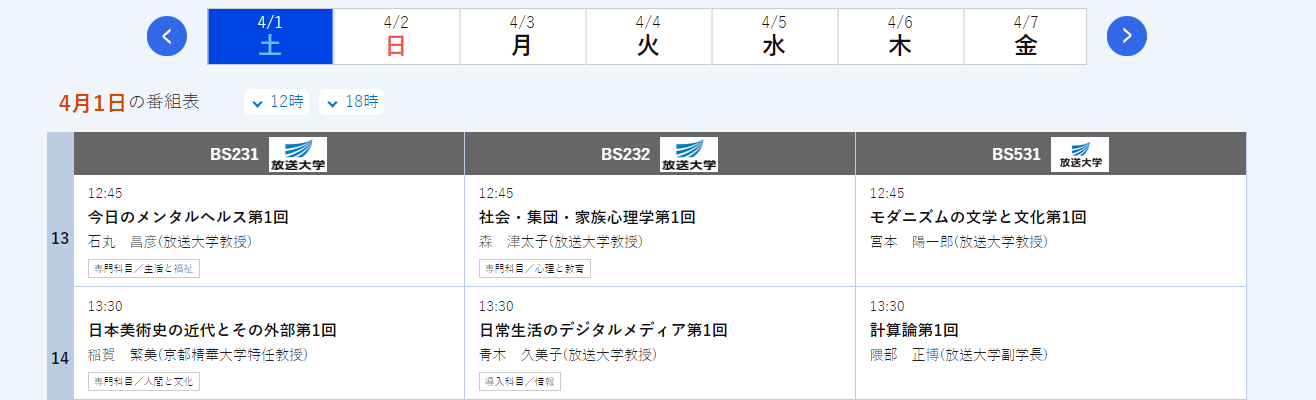学期ごとの授業番組の放送予定を記載した「番組ガイド」や、授業科目名から放送日時を探せる「授業科目放送日早見表」をご覧いただけます。