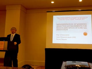 In the presentation titled, "Implementation of learning analytics environment for MOOCs and SPOCs at a HE/LLL institution", Prof. Yamada explained the current situation of MOOC and SPOC courses related to OUJ and introduced OUJ's efforts of learning analytics that is critical for assuring the quality of those courses.
