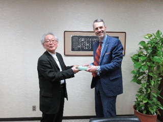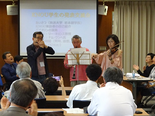 In an exchange meeting with OUJ faculty and staff, Vice President Iwanaga made the opening address and the visitors from KNOU introduced themselves in Japanese. The KNOU visitors and an OUJ student also presented a performance on violin, harmonica and clarinet.