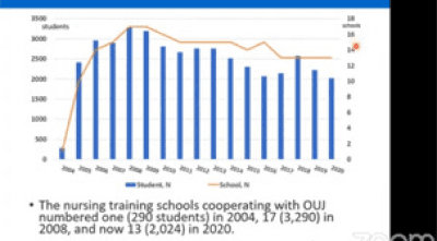 Professor Togari made a video presentation titled “A cooperative nursing professional education at the Open University of Japan.” He talked about a correspondence course in which nursing training schools cooperate with OUJ to help students qualify for the National Nursing Examination, and described trends among users of this education service.