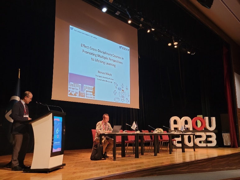 Prof. Nikoh gave a presentation titled “Cross Disciplinary Courses in Promoting Multiple Perspectives to Lifelong Learners.” In his talk, he showed how students at OUJ utilize the university as a platform for lifelong learning, indicating that some students graduate from one course and subsequently enroll in another. He stated that, in order to inspire students to study in diverse academic fields, it is useful for them to take courses that introduce a single theme from various disciplines. To illustrate this concept, he shared an example of a course designed with this idea.