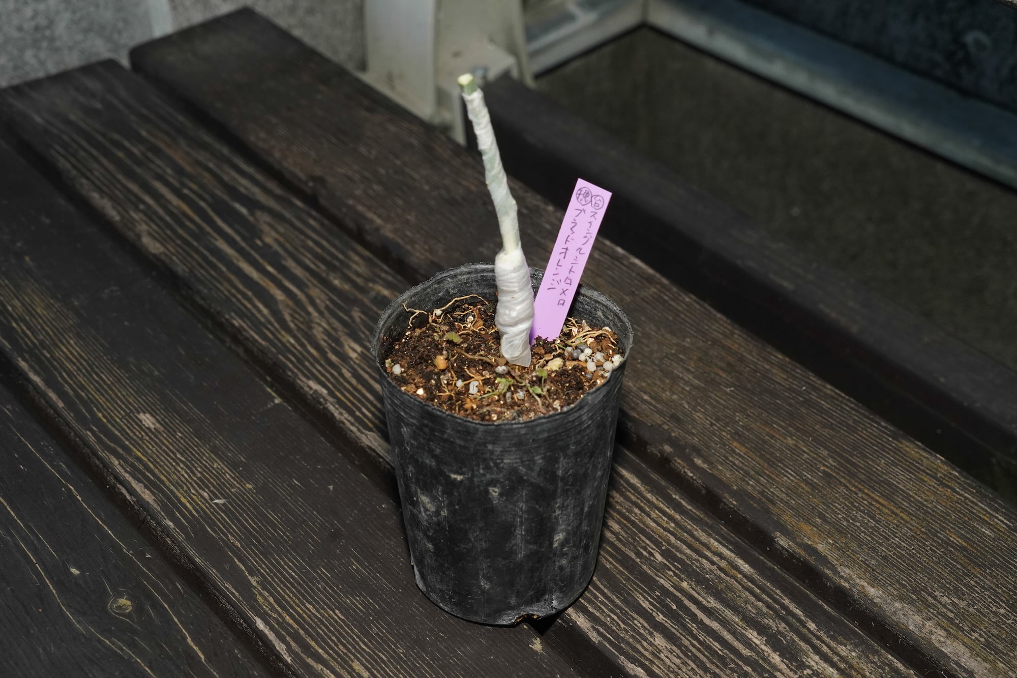 今のところ枯れていないので接ぎ木は成功ですが、実際に芽が出るのかは春にならないと分からないみたい。芽が出てくれることを願い品種をメモしたラベルを添えて作業を終えました。自宅に持ち帰って大切に育てていこうと思います。 -